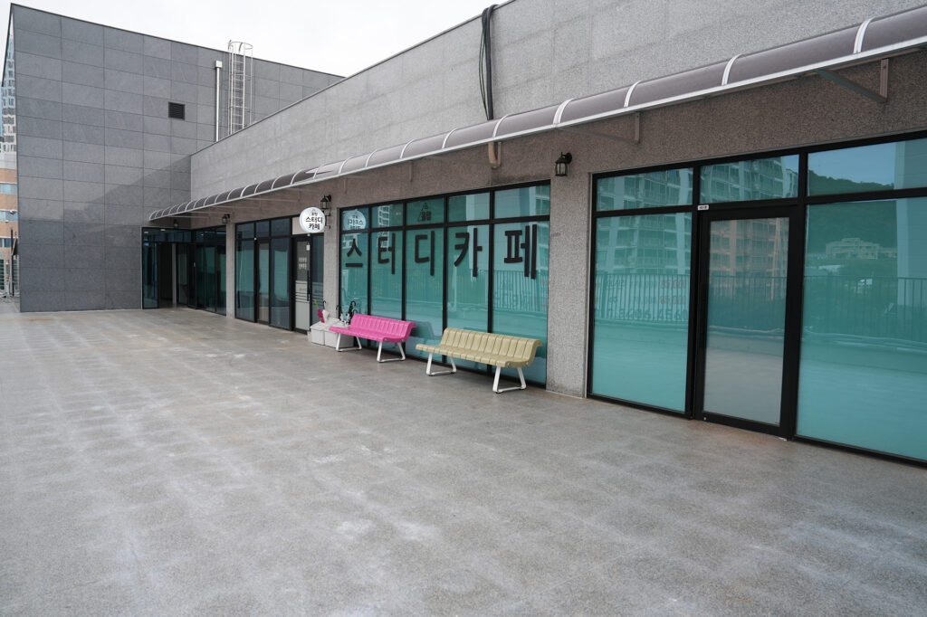 야외 테라스는 스터디카페 입구 앞쪽에 있으며, 감성적인 카페 벤치에서 커피 한잔 하며 잠시 휴식을 가질 수 있습니다.